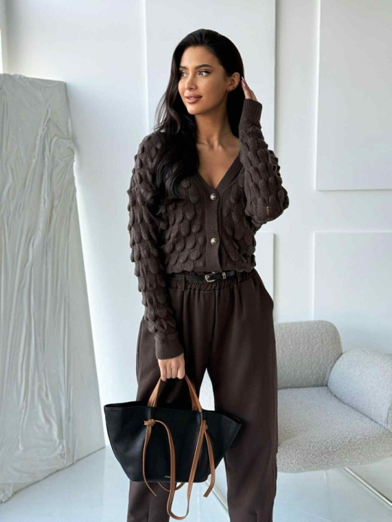 Sweter czekoladowy z ozdobnym splotem 3D i guzikami 1566